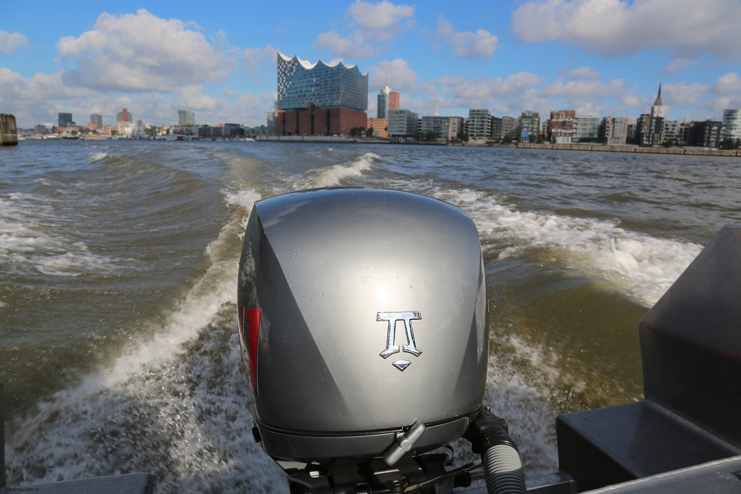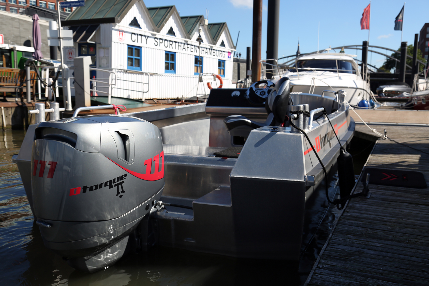 Our booth’s visitors were delighted to have the technical details of our motor explained, which is now close to the start of series production. Furthermore some of them could take a shuttle car by courtesy of “Premium Mobile Kuntz” from Gettorf – taking this opportunity to thank them very much – to the City sports harbour to go aboard. On a Tinn-Silver 530 the passengers were then able to experience the engine smoothness and power of our Dtorque 111 for themselves whilst enjoying the best possible weather and the gorgeous backdrop of the Elbe Philharmonic Concert Hall.